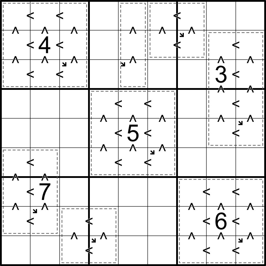 Within cages, digits do not repeat, and larger digits are pulled in the direction of the arrow. That is, within a cage, rows increase from left to right, while columns increase from top to bottom.